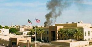 कुवेतस्थित अमेरिकी राजदूतावासको पृष्ठभूमिमा धुँवाको मुस्लो देखिन्छ।